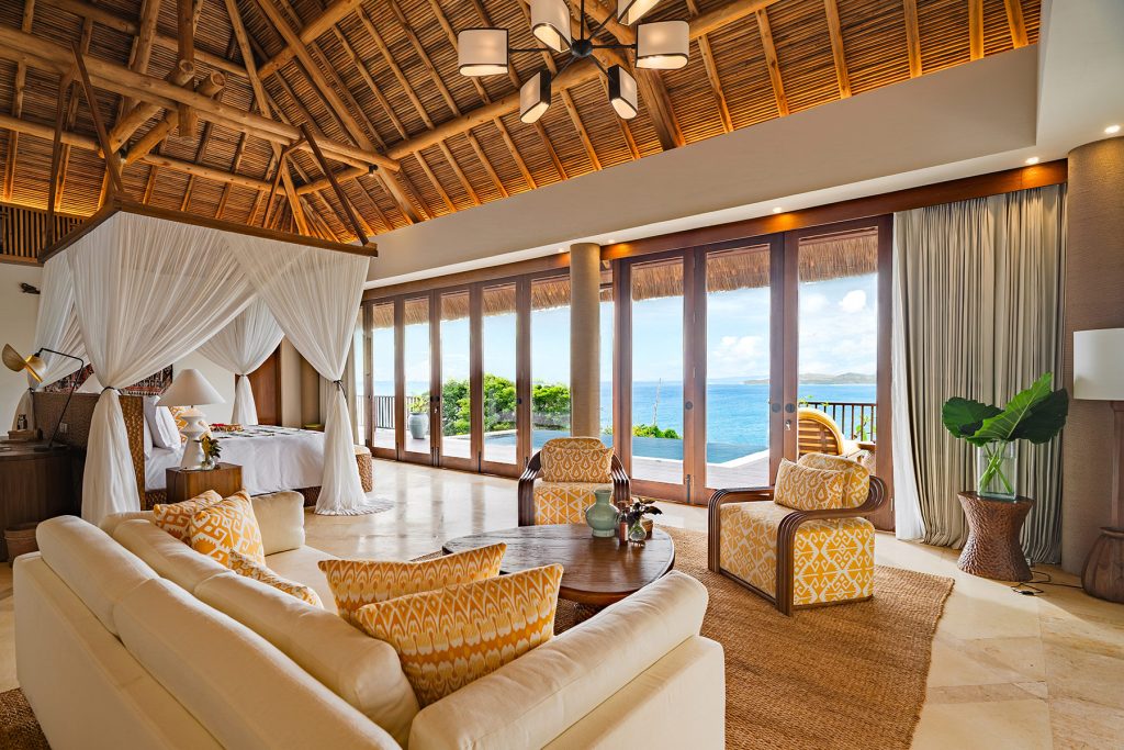 Aerial view of Raja Mandaka, Chris Burch’s private villa at NIHI Sumba, overlooking the turquoise waters of the Indian Ocean and the resort’s 2.5 km stretch of white sand beach, surrounded by lush tropical greenery