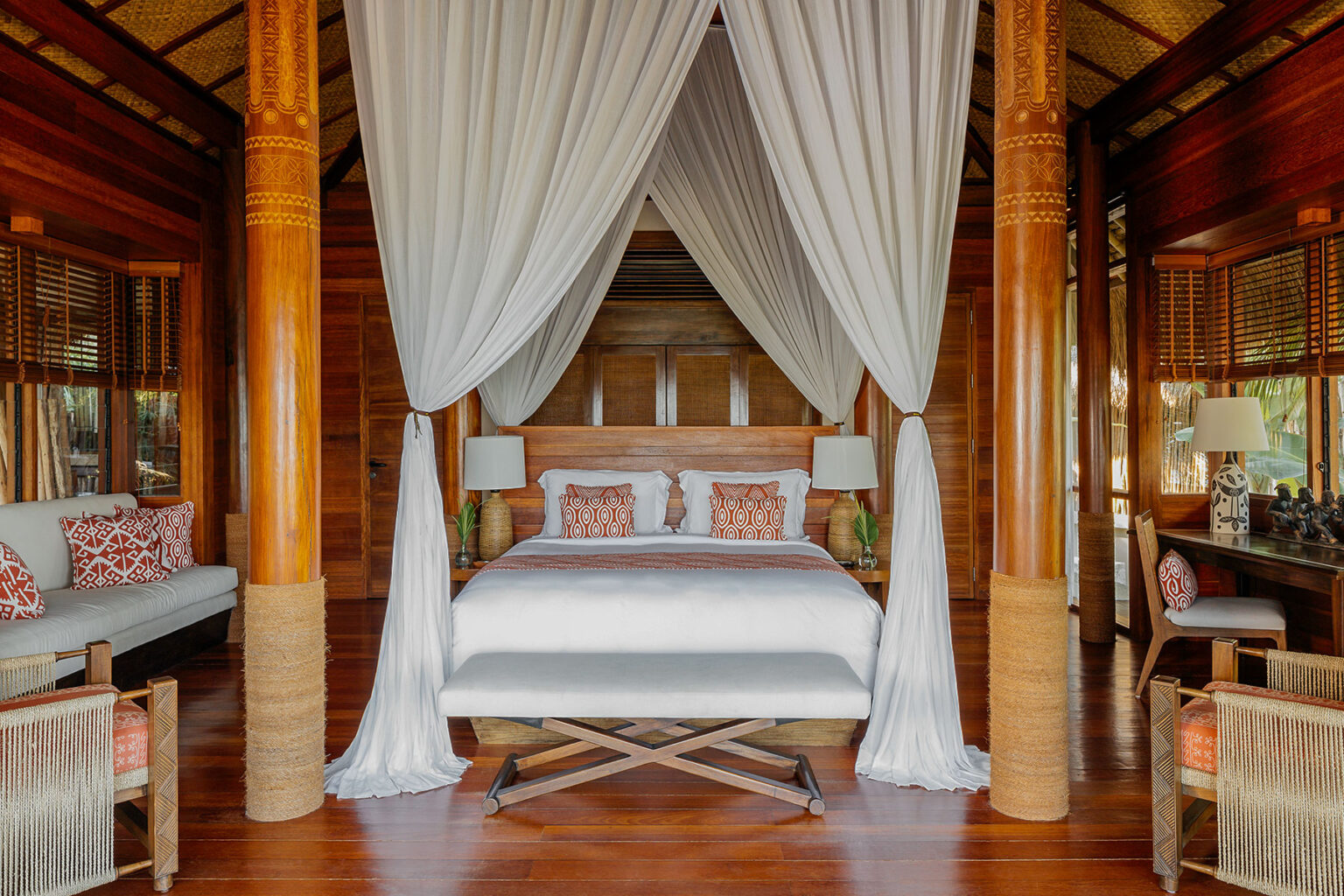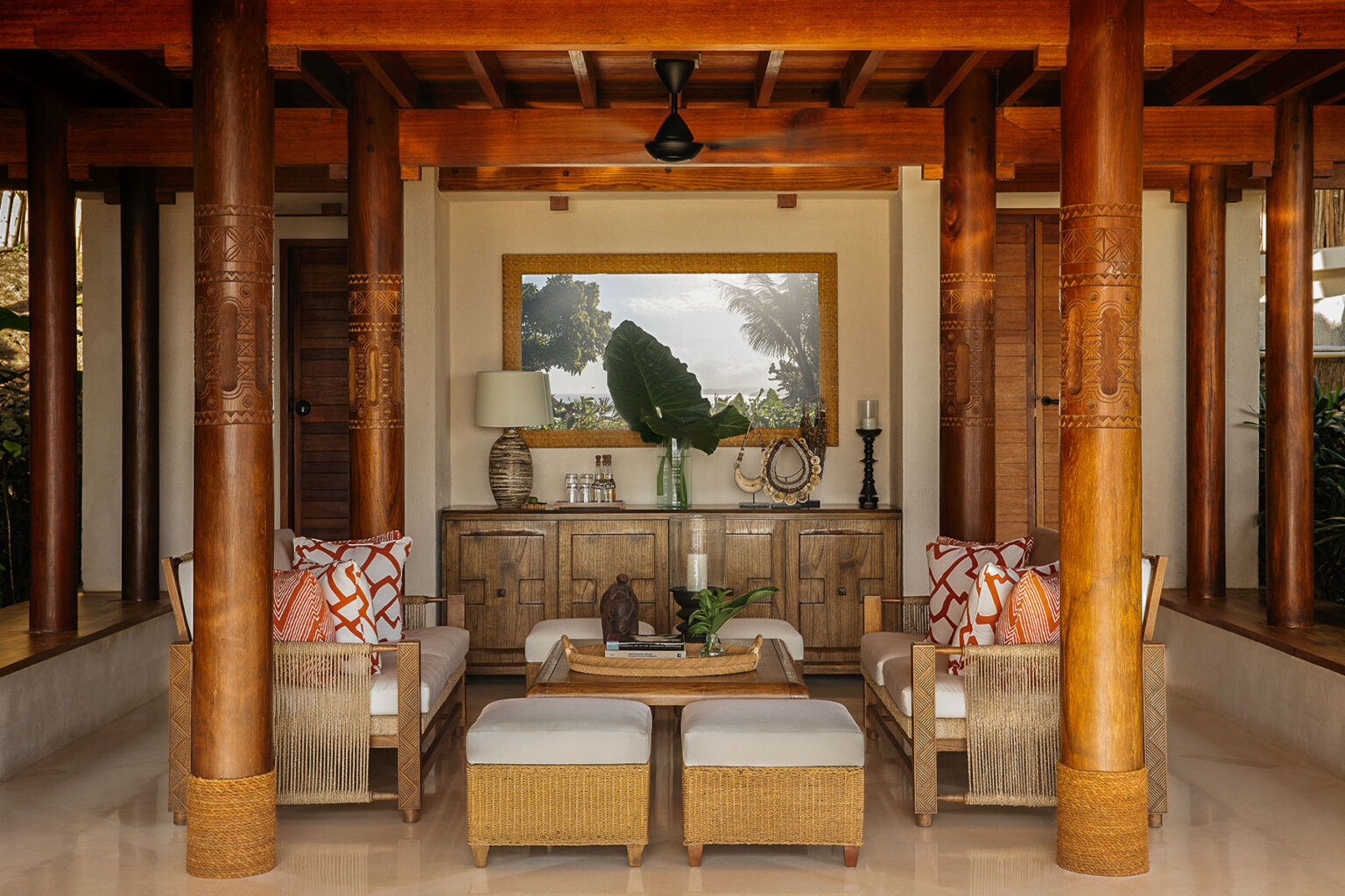 The upper floor houses a spacious primary suite with a canopy bed, an outdoor shower platform and its own private balcony oriented towards the Indian Ocean. On the ground floor is an open-air living area and an expansive deck with a private pool.