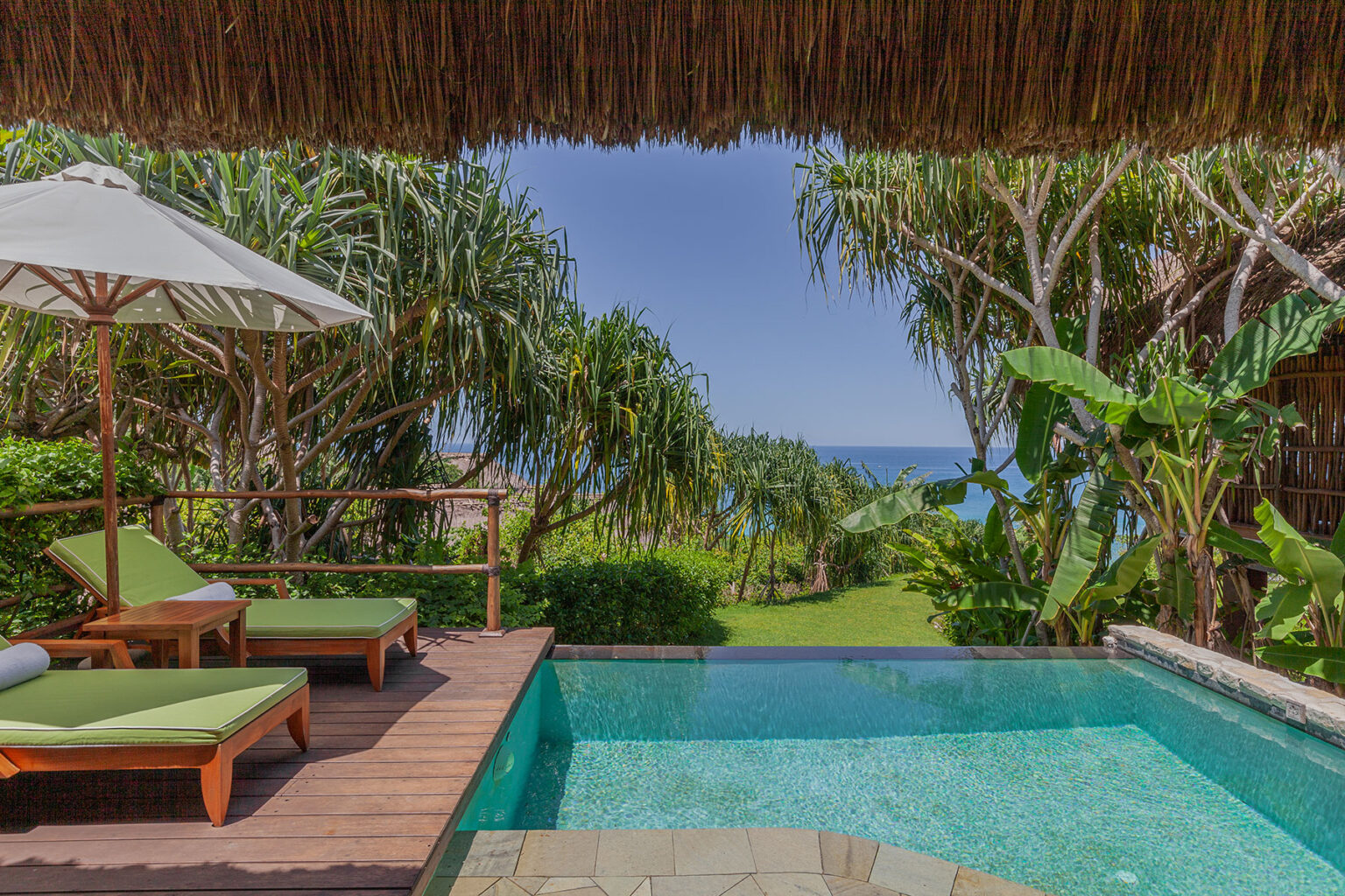 Private pool at Mandaka Sumba House with lush tropical gardens, palm trees, and traditional thatched architecture, offering breathtaking views of the ocean at NIHI Sumba