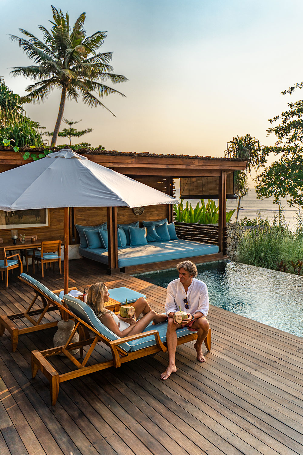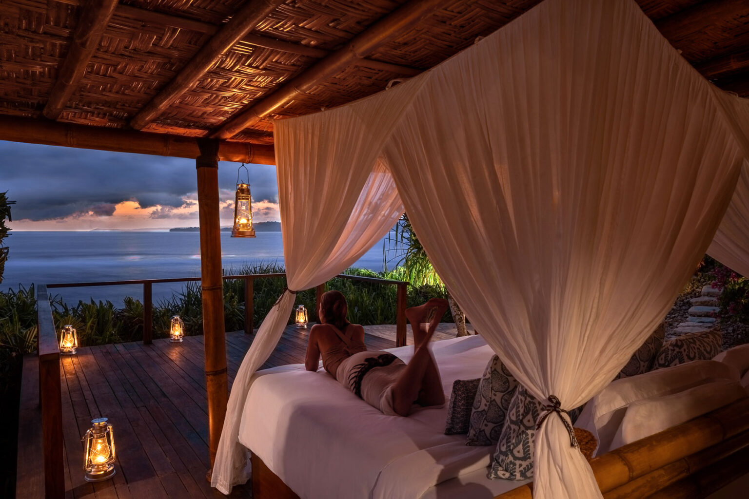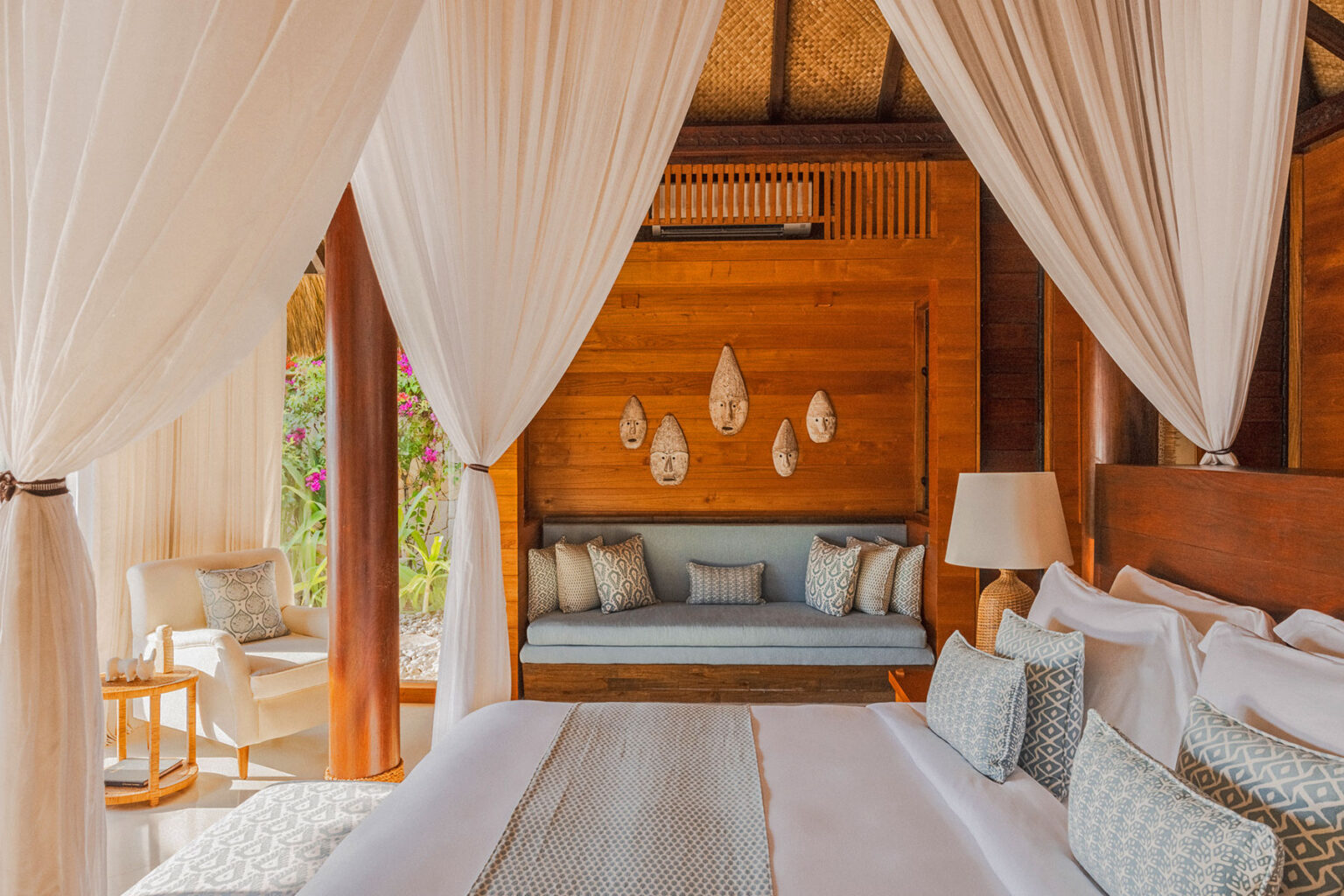 Set on the coastline of NIHI Sumba with uninterrupted views of the horizon, this is a one-bedroom villa for those who want to wake up looking at the ocean and spend the day captivated by it. The villa includes a plunge pool, an outdoor shower, a large soaking tub, and an open-air dining area. At the edge of the garden is a private bale that sits above the coastline, furnished with a king-size daybed. The space can be arranged for private dining, spa treatments, or prepared for overnight sleeping beneath canopy netting.
